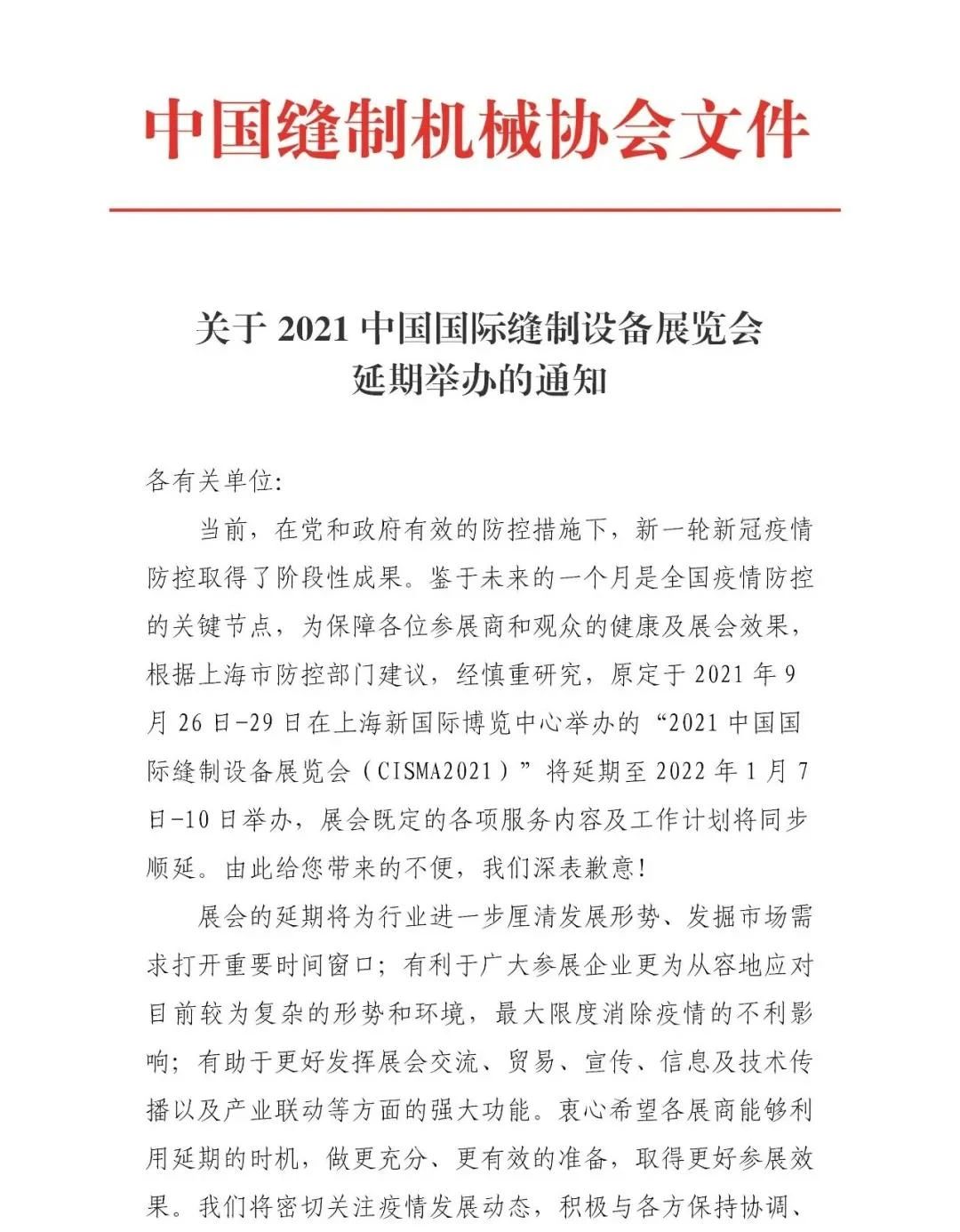 接主办方通知,原定于2021年9月26-29日举办的“2021中国国际缝制设备展览会(CISMA2021)”开展时间延期至2022年1月7-10日举办。