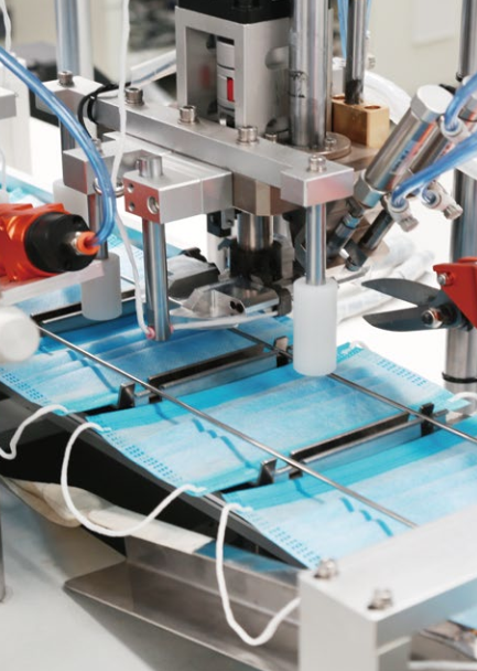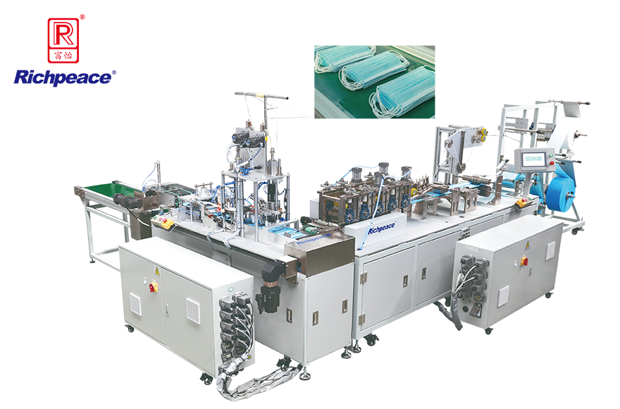 1.生产线采用“ 一拖一 ”的结构,自动送料、剪切鼻夹并完成口罩打片后, 自动传送到耳带工位焊接耳带,并自动码垛。