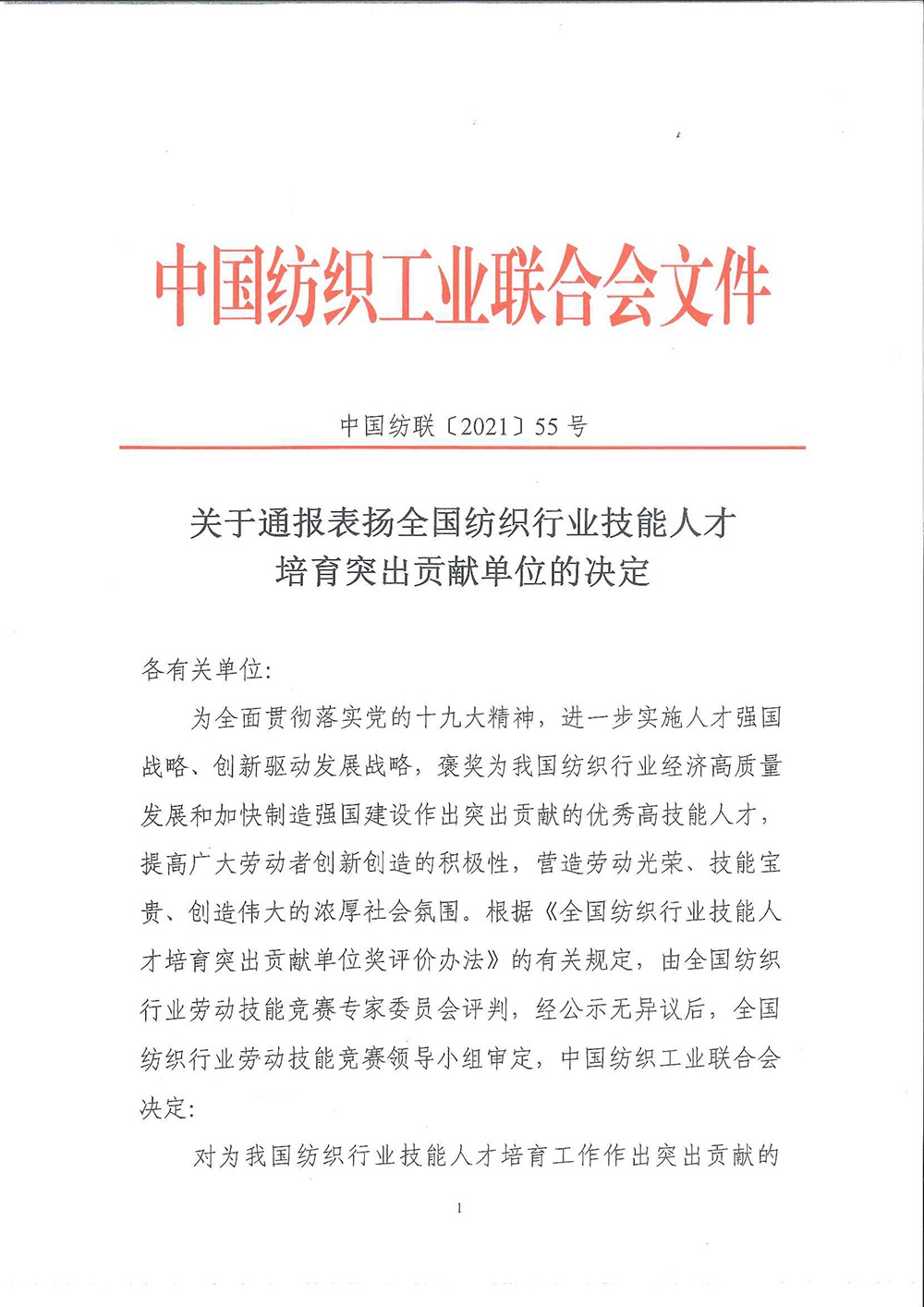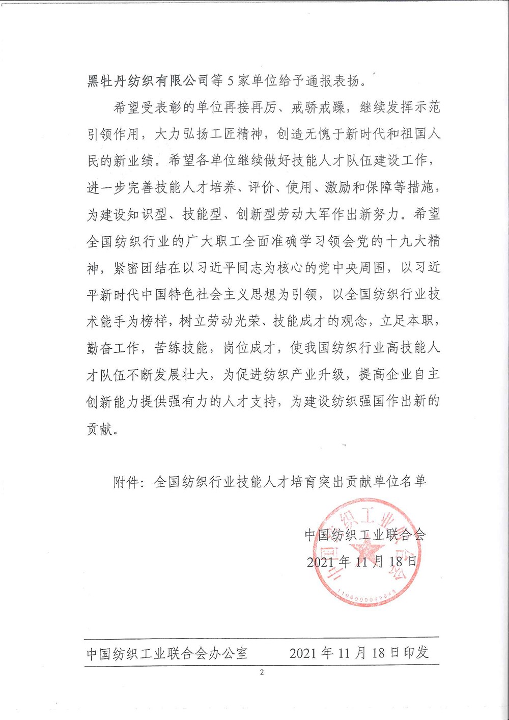 热烈庆祝九游体育被评为“2021全国纺织行业技能人才培育突出贡献单位”