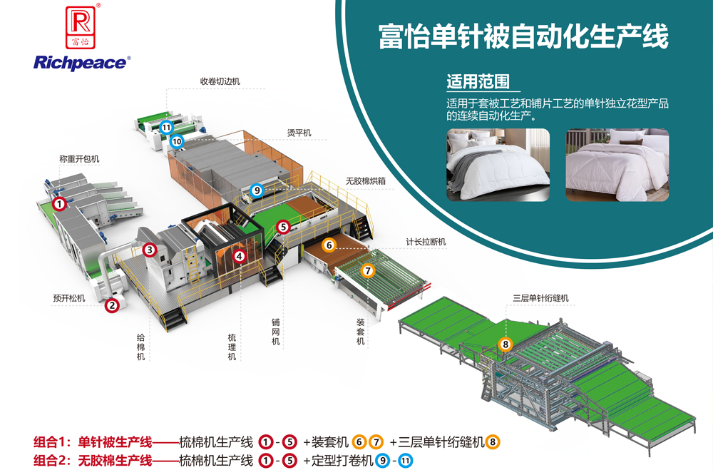 组合1:单针被生产线——梳棉机生产线+装套机+三层单针绗缝机