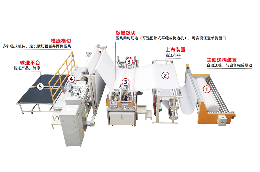 1、集棉片裁剪、被壳缝制、四边缝纫留口多道工序一体化完成。