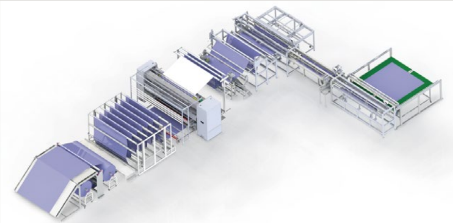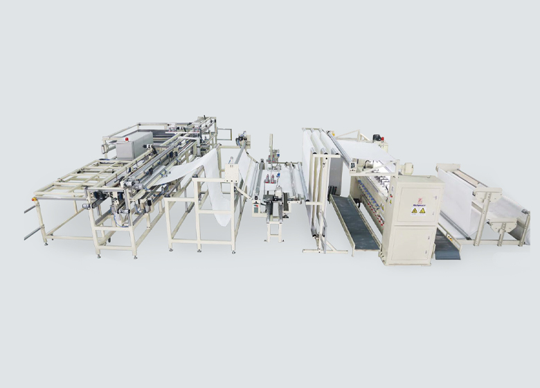 1、由来料储料调节控制机构,可调宽度的侧边缝制机构,长度可控的横裁机构,同步控制的横向输送机构,自动剪线的横缝机构和
